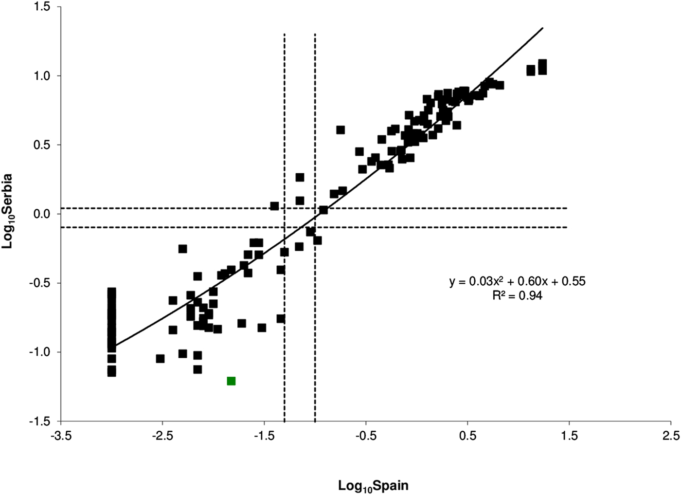Fig. 2. Anti-VZV ELISA results of the standardisation panel obtained by Serbia (y-axis) plotted against the corresponding results of the reference laboratory (Spain, x-axis) on the logarithmic (base 10) scale. Dotted lines show the equivocal ranges (negative/positive cut-off values), while the solid line represents the quadratic regression model. The only outlier is shown in green.
