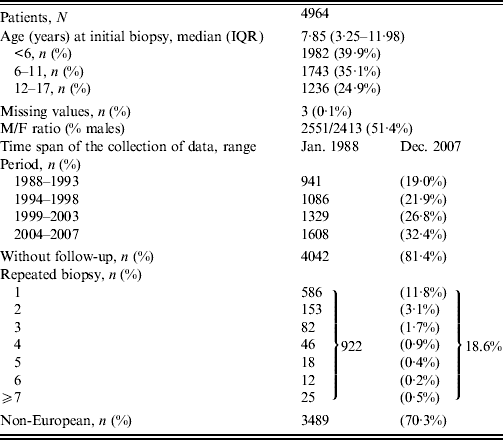 During the study period (Table 1), 4964 patients initially aged <18 years underwent an upper gastrointestinal endoscopy with gastric biopsy (antrum±fundus) and H. pylori culture. Median age was 7·9 years with an interquartile range of 3·3–12·0 years. Slightly more than a third (39·9%) of subjects were aged <6 years and a quarter (24·9%) were aged 12–17 years. Most patients (70·3%) were of non-European origin and sex ratio was close to unity. The data collection covered the period between January 1988 and December 2007, with a steady increase in the number of subjects during each 5-year period. Out of the initial group of 4964 patients, at least one subsequent upper gastrointestinal endoscopy with gastric biopsy and H. pylori culture was obtained in 922 subjects (18·6%). The majority (586/922, 65·6%) were examined twice while repeated biopsies with H. pylori culture reaching ⩾7 were performed for 25 patients.