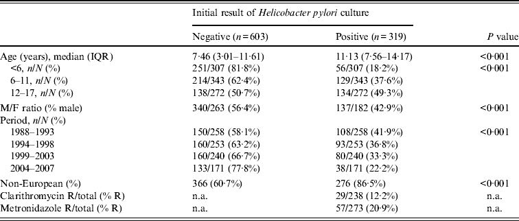 Table 2. Baseline characteristics in 922 patients with repeated gastric biopsies and Helicobacter pylori culture