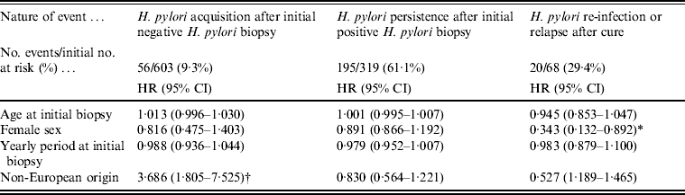 In our previous analysis, the risk of H. pylori-positive biopsy was associated with geographical origin (non-European origin – immigrants mainly from Maghreb in Brussels). The same association was observed in the present analysis: non-European origin had a significant effect on the acquisition rate of H. pylori infection. Besides this association, a decreased risk of re-infection/relapse in females was documented, with a modest P value (P = 0·028). Due to the multiplicity of association tests, this result requires further confirmation and should not be considered definitive.