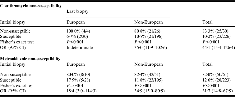 Percentages of susceptibility and of non-susceptibility to either antibiotic at initial biopsy did not differ in European children and in non-European children (P > 0·10).