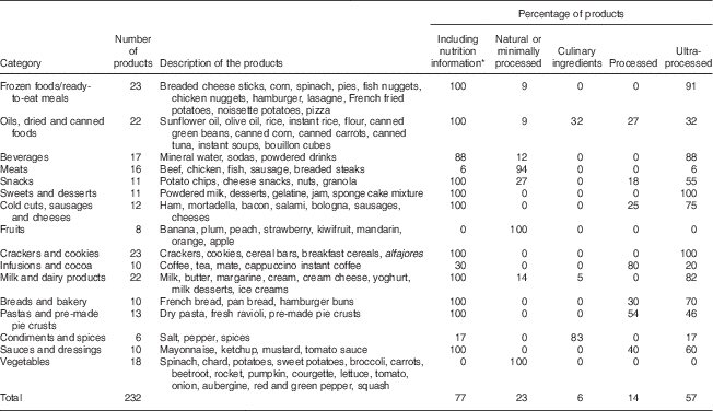 * Following Uruguayan legislation, nutrition information was not included on products that are commercialized unpackaged (e.g. meats, fruits and vegetables), mineral water, infusions and spices( 45 ).
