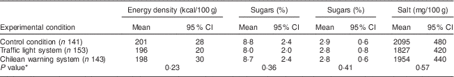 Table 4 Mean nutritional composition (and 95 % CI) of the products purchased by participants who completed the task in the control condition (without nutrition information) and with two front-of-pack nutrition information schemes (traffic-light system and Chilean warning system)
