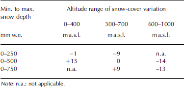 Table 2. Annual mass-balance differences between DDM runs based on different starting conditions of the snow cover. Each snow pattern shows a specific variability throughout the transition zone between the ablation and accumulation zones. Snow depth is scaled linearly, using six classes between the stated upper and lower limits of altitude and snow depth. The pattern of the chosen model uses a starting snow cover of 0–500mmw.e. that is scaled between 300 and 700ma.s.l.