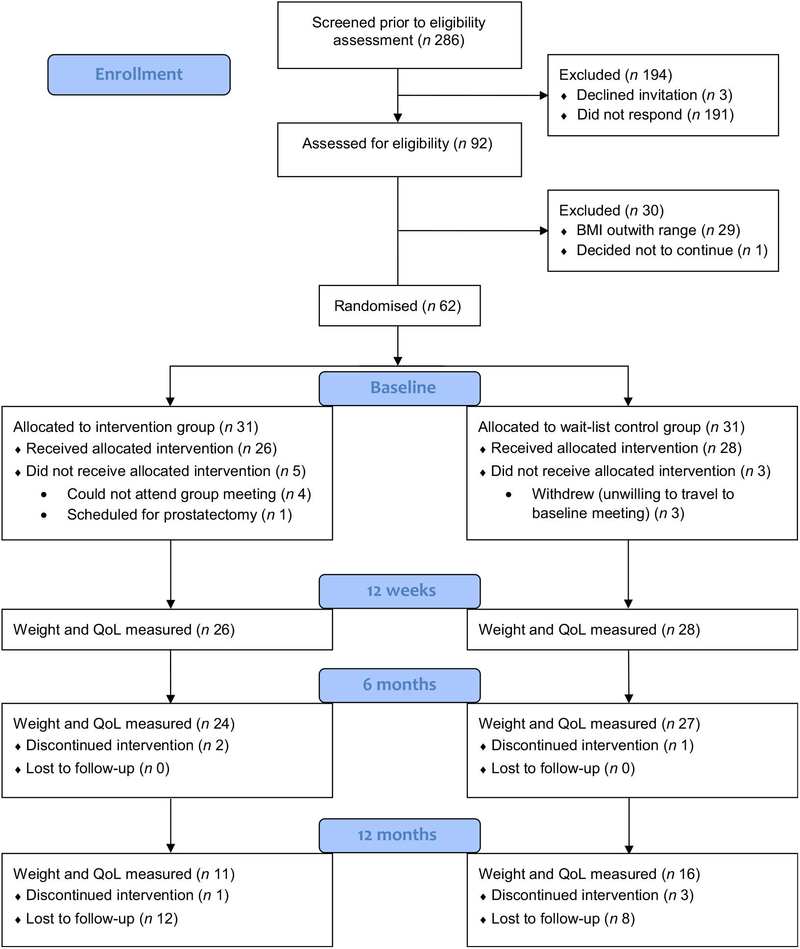 Twenty-four of the twenty-six men in the intervention group and all twenty-eight men in the wait-list mini-intervention group completed the outcome measurements at 12 weeks. At 6 months one participant from the wait-list mini-intervention group did not complete the weight and QoL measures as he had undergone a hip replacement. At 12 months, eleven men in the intervention group and sixteen in the wait-list mini-intervention group provided data on their weight and completed QoL questionnaires.