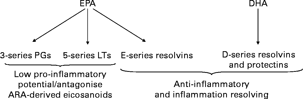 EPA and DHA both give rise to a family of lipid mediators termed resolvins (Fig. 2). The pathways of synthesis of resolvins are complex and not fully elucidated yet, but they involve the action of both COX and LOX enzymes and may be modified in the presence of aspirin. E-series resolvins are produced from EPA and D-series resolvins from DHA. DHA is also a substrate for similar molecules called protectins, also known as neuroprotectins. A large number of studies using cell culture and animal models have convincingly shown that E- and D-series resolvins and protectins are anti-inflammatory, inflammation resolving and immunomodulatory(Reference Serhan, Clish and Brannon37–Reference Marcheselli, Hong, Lukiw and Hua Tian41). There is very limited human data on resolvins and they have not yet been studied in the context of RA.