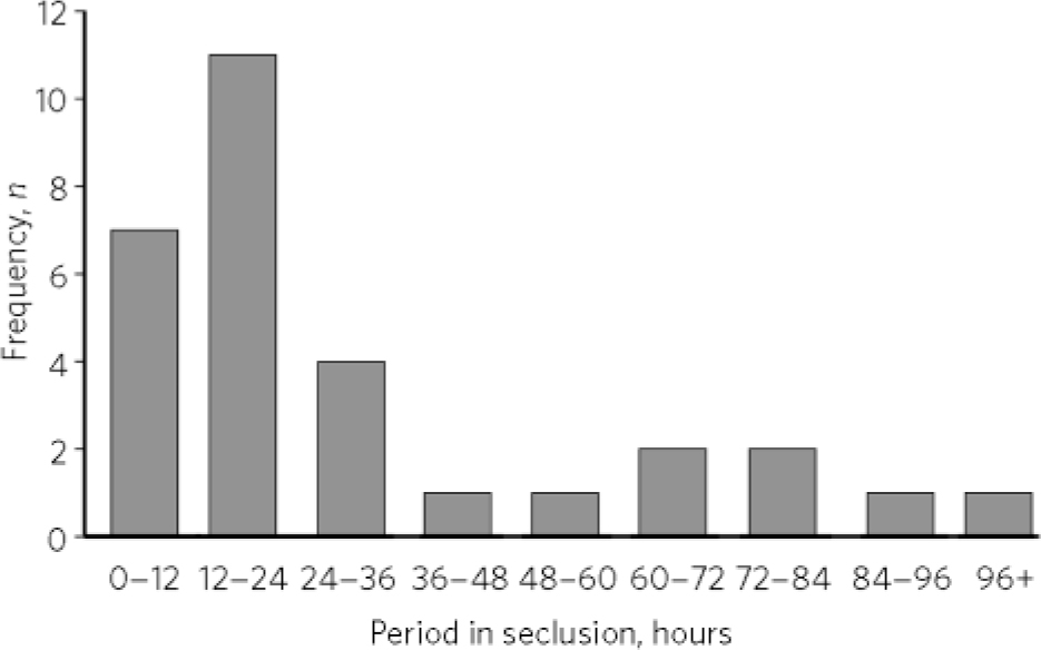The median time spent in seclusion was 17 hours (s.d. = 28.0; mean 30.5; minimum 1.45, maximum 99). The median duration of seclusion initiated during the day shift seemed comparatively longer (24.2 hours) than seclusion initiated during the evening (16 hours) and night (9.15 hours) shifts, but this difference was not significant. Most (60%) of the patients in the secluded group were secluded only once. Thirteen per cent (4 patients) were secluded twice and one patient was secluded four times. Fig. 1 illustrates the duration of seclusion events.
