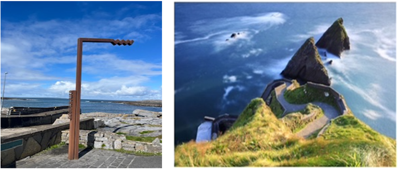 It is celebrated as one of the country’s most successful blue tourism initiatives designed to attract tourists outside of key sites to more remote, rural, and ‘authentic’ parts of the country. WAW is framed as contributing to the well-being of coastal communities through trickle down economies, but this comes with limited actions to ensure sustainability of the very resources drawn on to promote this ecotopia. For example, there are limited public transport options for visiting the route, and the campaign actively promotes it as a drive. But a significant increase in tourist numbers brings with it an increase in traffic to spaces previously unimpacted by traffic congestion, with little care given to the ecological impact of such increases. Yet, this human-centred approach is at a disjuncture with the reality that Ireland’s WAW is dynamic seascape shaped by the North Atlantic drift and seasonal storms (such as El Niño), and has a rich biodiversity including marine animals, coral reefs, kelp forests, and migratory seabirds. A seascape that can and does exert an agency of its own—for example, rising sea levels—are indicative of the sea’s capacity to disrupt the economic success of this initiative.