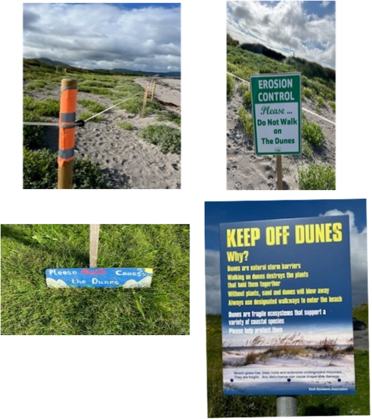 These images are relevant to multispecies entanglement for the following reasons. First, Figure 6 exemplifies the type of disturbed agency related to Latour earlier in this article. The sand dunes ‘grieve’ through the wave-induced erosion, and the humans, through the enactment of their own agency to protect the sand dunes, express their attunement to the fate of the sand dunes. Each of the examples in Figure 6 are the actions of local community groups. In a way, this exemplifies from the human perspective the emotional process of solastalgia at play in the semiotic landscape—where solastalgia is understood as the emotional distress caused by environmental damage that is most keenly felt when it affects one’s home or sense of place (Albrecht Reference Albrecht2005). From a multispecies perspective, the waves, sand dunes, and humans represent an emerging climate resilience when entanglement of place and species mobilises action, care, and resistance. In attuning to the ordinary Anthropocene of the waves and the sand dunes, the need for further examination of solastalgia becomes apparent.