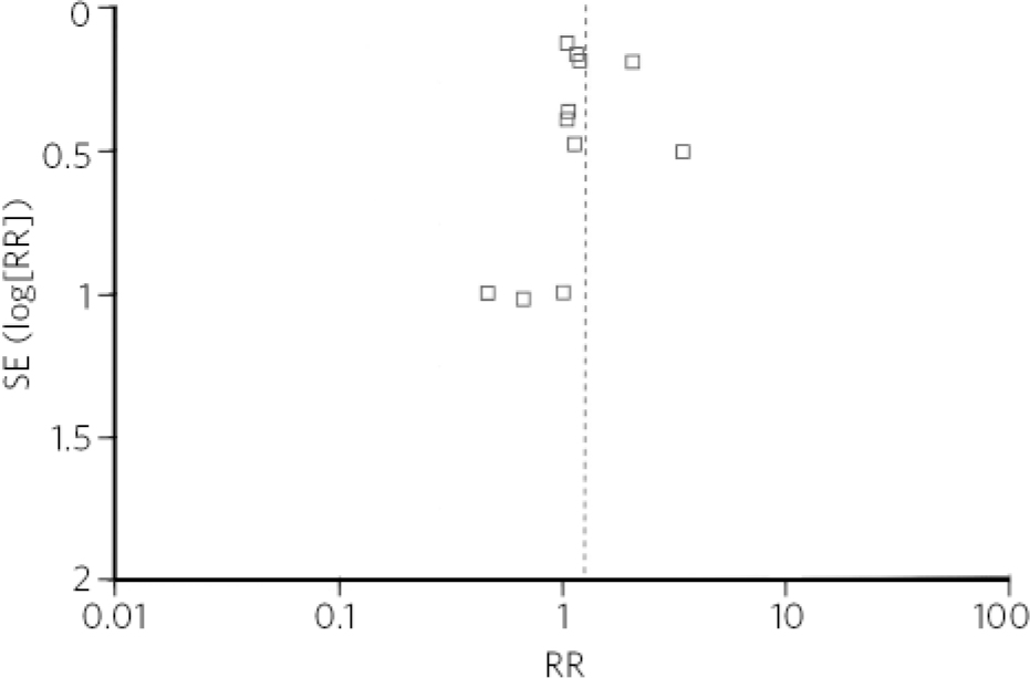 Fig 2 Funnel plot of studies included in the meta-analysis. RR, risk ratio; SE, standard error.