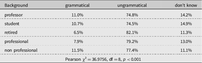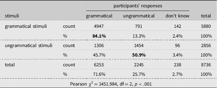 The accuracy means from a chi-square analysis are displayed in Table 1 and show that overall, participants performed relatively well in correctly accepting grammatical stimuli (84.1%), but poorly in rejecting ungrammatical stimuli (50.9%). The difference is statistically significant (p < .001). Their confidence levels measured by the ‘don’t know’ percentages are high since the percentages are low (2.7% overall).