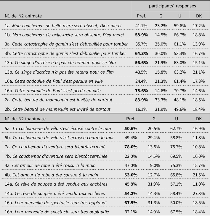 Table 4 shows the results for the N1 de N2 constructions. Participants indicated whether they thought the sentences were grammatical (G), ungrammatical (U) or if they did not know (DK). The ‘corrections’ column lists the number and percentage of participants (out of 168) who provided corrections to the sentences they rejected as ungrammatical (see Appendix A for the complete list).