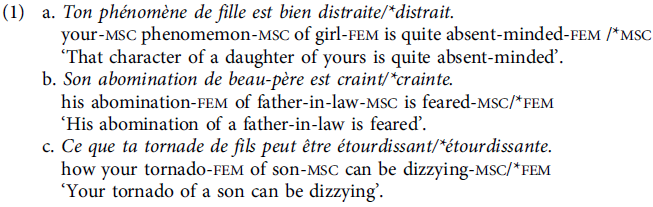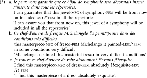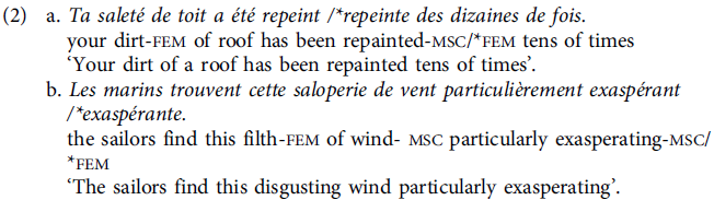 According to Hulk and Tellier (Reference Hulk, Tellier, Authier, Bullock and Reed1998, Reference Hulk and Tellier2000), when N1 and N2 differ in gender, the adjective agrees with the animate N2 assumed to be the nominal head of the construction as in (1a, b, c). However, when the N2 is an inanimate noun, the adjective may or may not agree. In (2a, b) the adjective agrees with the inanimate N2 (Hulk and Tellier, Reference Hulk, Tellier, Authier, Bullock and Reed1998: 185).