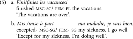 Agreement appears to be optional with fini ‘finished’ and mis à part ‘except for’Footnote 4 :