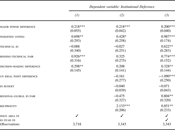 Notes: Results of generalized linear models estimating the effect of member state power and IO characteristics on directed institutional deference. All models include controls for membership overlap, an indicator for nested IOs, and a cubic polynomial for time (not shown). Statistical significance is denoted by: *p < 0.1; **p < 0.05; ***p < 0.01.