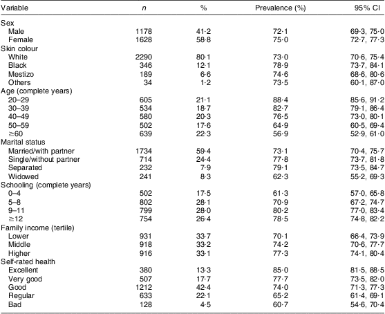 We investigated the following characteristics of participants: sex, age (in complete years), self-perceived skin colour (according to the Brazilian Institute of Geography and Statistics classification; the categories ‘yellow’ and ‘indigenous’ were merged into ‘others’), current marital status (married/with partner; single/without partner; separated; widowed), schooling (in complete years), household income (according to the Brazilian Institute of Geography and Statistics concept) and self-rated health (excellent; very good; good; regular; bad). In the hierarchical model, demographic variables (gender, skin colour and age) and socio-economic variables (marital status, schooling and family income) were used in the first level of determination. In the second level, self-rated health was used.