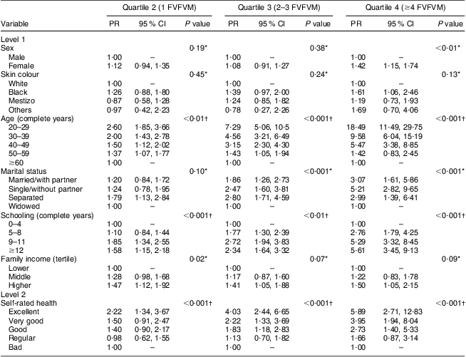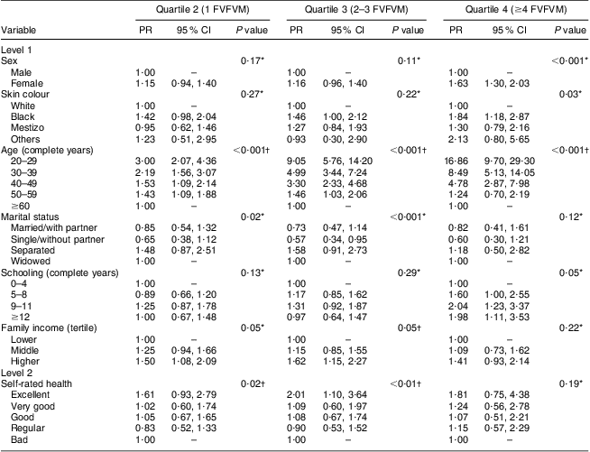 The results for FVFVM consumption in quartiles are summarized in Tables 2 and 3. After adjustment, the difference between the sexes was marked in the fourth quartile, where women were 1·63 times more likely to have higher FVFVM consumption than men. The association with skin colour was observed only in the fourth quartile of the adjusted analysis, where participants of black skin colour showed almost two times higher prevalence of FVFVM consumption than white participants. In both crude and adjusted analyses, the differences among age groups increased progressively from quartile 1 to quartile 4 of consumption, with a maximum gradient in the age group of 20–29 years compared with the reference group of ≥60 years. Concerning marital status, there was strong association in the adjusted analysis only for quartile 3, where the single participants were less likely to consume FVFVM compared with the reference group of widowed.
