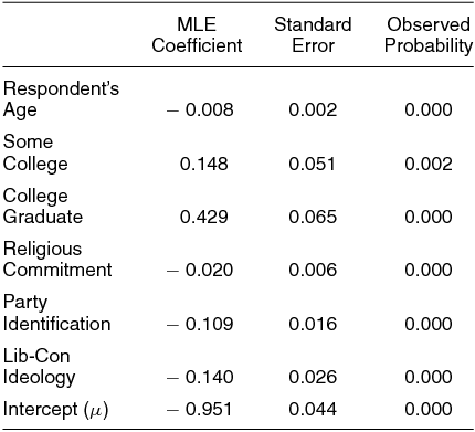 Table 3 contains the maximum likelihood estimates for the circular regression model predicting the orientation of the individual vectors as a function of a set of explanatory variables (definitions for all of the independent variables are provided in the Appendix). Initially, the model also included regressors for gender, race, family income, religious denomination, and region. But, preliminary estimates showed that none of these additional variables have any effect once those in Table 3 are taken into account. Therefore, they are omitted from the reported model.