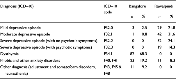 The various (primary) diagnoses reached for the populations sampled are given in Table 1. Most cases (72% in Bangalore, 92% in Rawalpindi) fall under the broad diagnostic category of mood (affective) disorders (ICD-10 codes F32-39), the remainder being made up of neurotic and somatisation disorders. The most common (primary) diagnoses in the Bangalore site were dysthymia (68% of the sample), and phobic and other anxiety disorders (19%). In contrast, only 8% of cases in Rawalpindi were diagnosed as having phobic and other anxiety disorders, and there were no diagnosed cases of dysthymia. Rather, the majority of cases were diagnosed as having depressive episodes (22% mild, 32% moderate and 35% severe, of which over a third had psychotic symptoms).