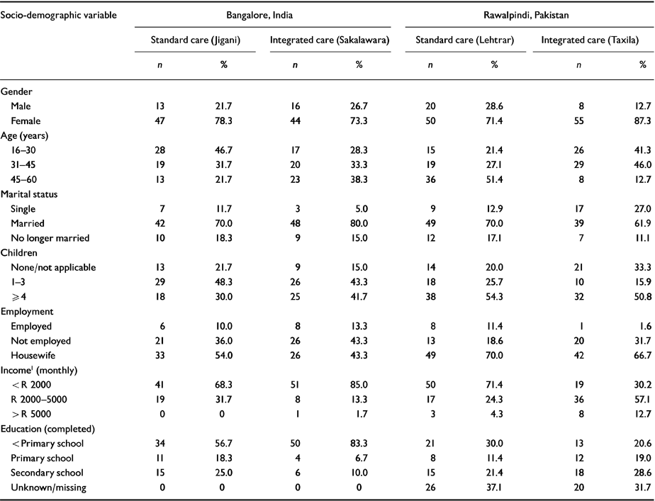 We acknowledge and thank the staff of the Institute of Psychiatry, Rawalpindi and the National Institute of Mental Health and Neurosciences, Bangalore; in particular, the field workers in each centre: Dr Muhammed Naeem Khan and Zafar Iqbal (Rawalpindi); Dr Anita Vasudevan and Chetan Pillai (Bangalore). Dr Catriona Waddington (Institute for Health Sector Development, London) provided additional health economics advice.
