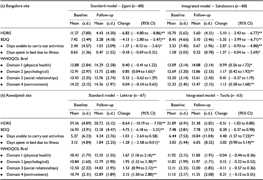 Baseline depression scores were markedly higher in the Rawalpindi site, indicating greater psychiatric morbidity. However, since the interviewers were not trained simultaneously or by the same trainer, it is conceivable that rating methods differed in the two sites. Results are therefore couched in terms of changes in scores over time in the two separate sites (Table 5). In overall terms, there has been an improvement in the positive outcome domain of quality of life, and significant reductions in symptomatology and disability. More specifically, in three of the four localities, there is a substantial reduction in levels of depression symptoms (between 5.1 and 8.6 points lower, each statistically significant at P<0.01). The exception is Taxila, which showed only a very modest, and not significant, reduction (0.5 points). Results for the Brief Disability Questionnaire (BDQ) closely reflect those for depression scores, in the sense that in all localities except Taxila there is a significant reduction by 6.2 to 7.9 points in overall disability score. There is a slight, though not statistically significant, increase in BDQ score for Taxila (0.3 points higher). There were statistically significant improvements in quality of life scores in Sakalwara and Lehtrar. There were only modest improvements in the Jigani catchment area population, and in Taxila there was no clear change either way.