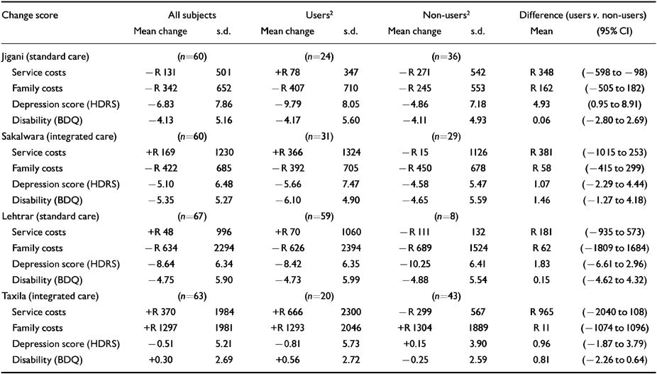 A summary of observed changes over time in the principal cost and outcome domains is given in Table 6, including a comparison of change scores between those who had been in contact with government primary and secondary health care and those who had only consulted local practitioners or not accessed care at all. For both localities in the Bangalore site, there are higher service costs but greater improvements in depression score (significantly so in Jigani, but not in Sakalwara, the integrated care locality). Government health care users also show greater improvements in disability change scores. There are no statistically significant differences in change scores in the Rawalpindi site, but again service costs are higher among government health care users. Depression and disability change scores are actually better among the (very small number of) non-users in the Lehtrar locality, and in Taxila users of government health care services showed a marginally better mean change score for depression but a slightly worse score for disability. In the two integrated care localities, therefore, there are no clear advantages in clinical or economic outcomes for users of government primary and secondary care services.