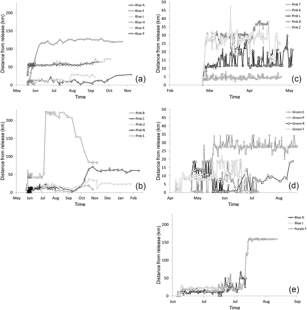 Figure 2. Distance from release site over time for rehabilitated Carnaby’s Cockatoos released with satellite tracking devices on (a) 18 May 2012 at Perry Lakes, (b) 24 May 2012 at Yanchep National Park, (c) 25 February 2013 at Perry Lakes, (d) 5 and 24 April 2013 at Collier Park and (e) 5 June 2013 at Collier Park.