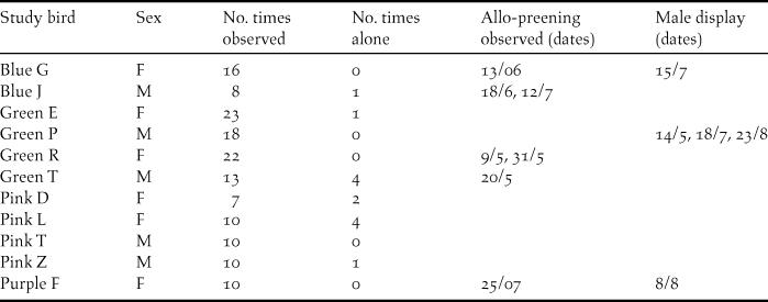 Of 160 follows of flocks containing at least one study bird, 147 (91.9%) involved direct observation of a study bird(s) foraging with a flock and roosting communally. Three study birds were found alone more than once (Table 1). The night roosts and feeding locations used by lone study birds were often ones previously visited with a flock, potentially indicating a capacity for spatial learning and memory.