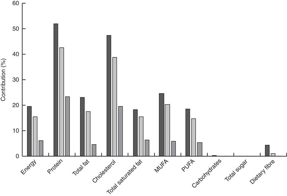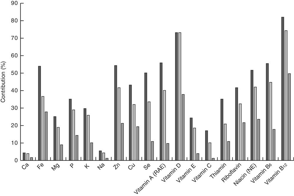 Data management and statistical analyses were performed with SAS statistical software package version 9.4. The percentage contribution of each food subgroup to total energy and nutrient intakes was calculated for the entire population, according to the population proportion method( Reference Krebs-Smith, Kott and Guenther 38 , Reference Block, Dresser and Hartman 39 ). Nutrients analysed include energy, selected macronutrients (protein, fat, carbohydrates, total sugar, saturated fat), dietary fibre, vitamins (A, C, D, E, B12, thiamin, riboflavin) and minerals (Ca, Fe, Mg, Zn, Cu, Se, Na). Dietary supplements, which were consumed by <10 % of all IHS respondents (IHS, unpublished results), were not included in the calculation of total nutrient intakes.