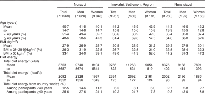 A total of 2595 Inuit adults (~1·3 participants per household) agreed to participate in the IHS. Complete 24h dietary recalls were available from a total of 2097 participants (1292 women and 805 men). Characteristics of the study sample are summarized in Table 1. The mean age of participants was 43 (sd 15) and 41 (sd 15) years for men and women, respectively. The mean BMI for men was 27·2 (sd 5·5) kg/m2 and 29·2 (sd 7·0) kg/m2 for women, both of which fall within the ‘overweight’ class (BMI=25–30 kg/m2) defined by WHO. The mean energy intake was 9837 (sd 5669) kJ/d (2351 (sd 1355) kcal/d) for men and 8209 (sd 4301) kJ/d (1962 (sd 1028) kcal/d) for women.
