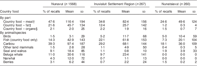 Across all regions, the most frequently consumed country foods, in terms of percentage of recalls that reported the item, were caribou (18–39 %, by region) and fish (7–22 %, by region; Table 2). Consumption of country food meat was reported by nearly half (47·6 %) of all participants in Nunavut, about a third (34·8 %) of participants in the ISR and almost a quarter of all participants (24·6 %) in Nunatsiavut (Table 2). A notable difference in the consumption of country food fat was observed between regions (22 % of respondents in Nunavut and approximately 1 % of respondents in Nunatsiavut), coincident with the consumption of marine mammals (Table 2).