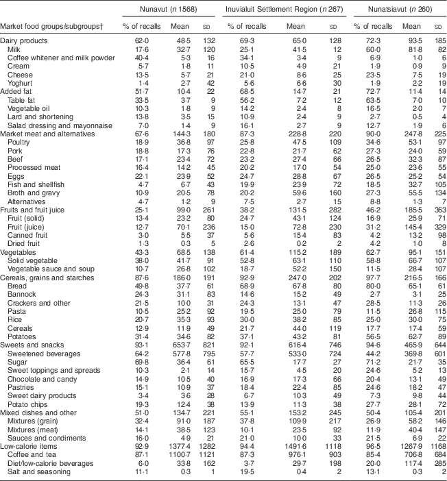 A total of 1591 (including ninety-three country foods) unique food and beverage (hereafter referred to as ‘food(s)’) items and/or preparations, corresponding to unique food codes in the Canadian Nutrient File (CNF), were reported in the dietary recalls. Alcoholic beverages (twelve unique items), which are legislatively prohibited in some Inuit communities, were excluded from all analyses. All foods and beverages reported as consumed in the IHS were coded hierarchically, by item similarity and food group (major and sub groups; see online supplementary material, Supplemental Tables 1 and 2). Similar food items in each recall were collapsed into a single item (e.g. ‘potato chips’ aggregated all potato chips of various seasonings) and compiled as a daily sum for the item (g/person per d). Food groups were based on the classification scheme of the USDA’s Food and Nutrient Database for Dietary Studies (FNDDS) 5.0( Reference Ahuja, Montville and Omolewa-Tomobi 33 ), with some exceptions to reflect culinary usage (e.g. butter was categorized as a ‘fat and oil’ as opposed to a dairy product) and the dietary habits of Inuit. Due to database limitations, foods reported as mixed dishes/recipes (e.g. pizza, sandwiches) could not be disaggregated into component ingredients. Thus, a ‘mixed dishes’ grouping was included and classified according to the dish’s primary ingredients (e.g. primarily meat dishes; primarily grain dishes). Potatoes were excluded from the vegetables grouping and included with ‘grains and starches’. Efforts were made to group market foods based on nutritional similarities (e.g. high-sugar beverages, such as fruit drinks and cola, were collectively grouped). However, food fortification practices in Canada( 34 ), such as the mandatory fortification of flour (with thiamin, riboflavin, niacin, folic acid and Fe), as well as the fortification of fruit-flavoured drinks with vitamin C (mandatory), folic acid (voluntary) and Fe (voluntary), can complicate these relationships.
