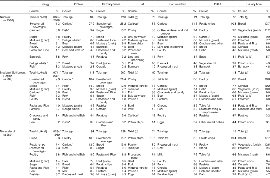 The purpose of the present study was to describe region-level population diets for a large sample of Inuit adults across the Canadian north. Specifically, our objectives were to: (i) identify principal dietary sources of energy and selected nutrients; and (ii) examine the relative contribution of country foods and market foods to energy and nutrient intakes.