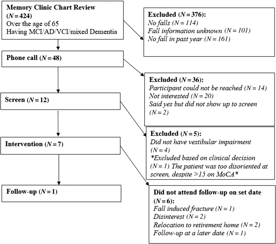 Patients who had attended the Memory Clinic and were ≥65 years of age, English speaking, had a diagnosis of MCI/AD/VaD/mixed dementia,Reference Albert, DeKosky and Dickson4–Reference Rockwood, Macknight and Wentzel7 fell within the past year and able to provide consent were contacted. Exclusion criteria consisted of additional neurological disease (i.e. seizures or stroke), severe psychiatric disease, current inner-ear infection, severe neck arthritis, Montreal cognitive assessment (MoCA) score < 15 or > 26 (v7.1)Reference Nasreddine, Phillips and Bedirian8 or other aetiology of dementia (i.e. Parkinson’s disease). Eligible patients were called (1 message/patient) and invited to a screen for VI. The MoCA, dizziness-handicap inventory (DHI) and activities-specific balance confidence scale (ABC) were administered for cognitive state, levels of perceived dizziness and confidence in performing daily activities without losing balance, respectively. VI was assessed using the Dix–Hallpike test,Reference Dix and Hallpike9 both the bedside- and video head impulse test (HIT and vHIT),Reference MacDougall, Weber, McGarvie, Halmagyi and Curthoys10 the Headshake test (HST)Reference Hain, Fetter and Zee11 and the modified clinical test of sensory interaction on balance (mCTSIB).Reference Cohen, Blatchly and Gombash12