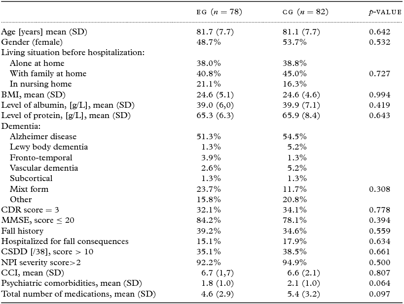 EG = experimental group; CG = control group; CDR = clinical dementia rating; MMSE = Mini-Mental State Examination; CSDD = cornell scale for depression in dementia; NPI = neuropsychiatric inventory; CCI: Charlson comorbidity index.