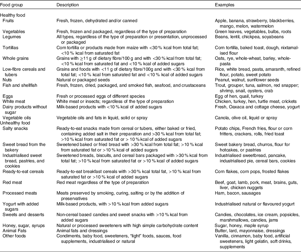 Foods (excluding beverages) were classified into twenty-three groups according to their nutritional characteristics. Healthy groups included: (1) fruits; (2) vegetables; (3) legumes; (4) tortilla (corn tortilla and other products mainly made of maize); (5) whole grains (≥11 g of fibre/100 g)(20); (6) low-fibre cereals and tubers (<11 g of fibre/100 g); (7) nuts; (8) fish and shellfish; (9) eggs; (10) white meat; (11) dairy products without sugar and (12) vegetable oils. Unhealthy foods included: (13) salty snacks; (14) sweet bread from the bakery; (15) industrialised sweet bread, pastry and crackers; (16) ready-to-eat cereals; (17) red meat; (18) processed meat; (19) yogurt with added sugar; (20) sweets and desserts; (21) honey, sugar and syrups and (22) animal fats. Additionally, we had a 23rd group with other foods (spices, coffee, tea, salt, sweeteners, light food and sauces). Due to its low nutrient contribution, it was not considered in the analysis.
