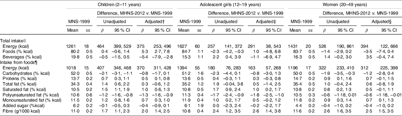 Table 3 Difference in means of total energy and percentage of energy contributed by nutrients from foods in Mexican children, adolescent girls and women between 1999 and 2012*
