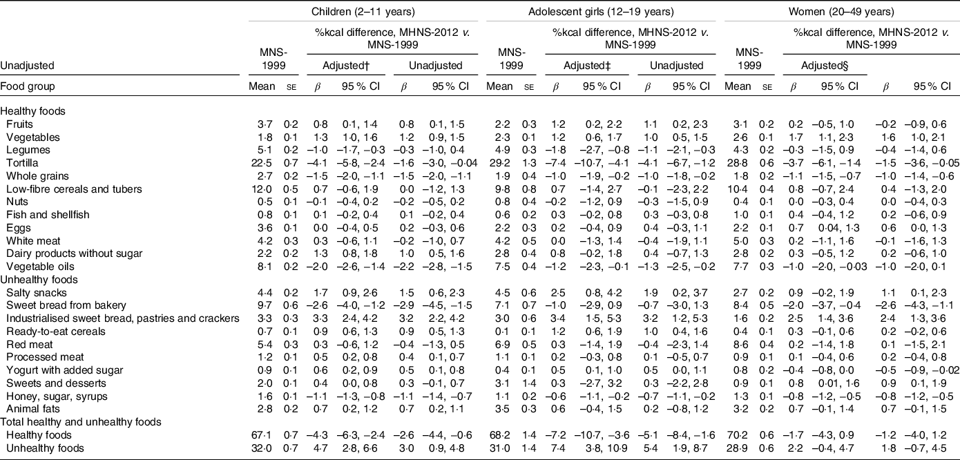 When adjusting for sociodemographic variables, we observed the same trends, except for some food groups. For tortilla, the change was attenuated considerably in all age groups in the adjusted model in comparison with the unadjusted model (children (-1·6 v. −4·1 pp); adolescents (-4·1 v. −7·4 pp); adult women (-1·5 v. −3·7 pp)). Moreover, the difference was smaller and was no longer statistically significant at least in one age group for legumes and yogurt with added sugar. We observed that in 1999, total intake of healthy foods ranged from 67·0 to 70·0 %kcal across all age groups, and from 1999 to 2012, it decreased by −4·3 pp in children and −7·2 pp in adolescents, whereas there was no statistically significant change among adult women (Table 4). Similar to the food groups, the changes estimated with the adjusted model in the healthy and unhealthy food groups were attenuated compared with the unadjusted model but remained significant.