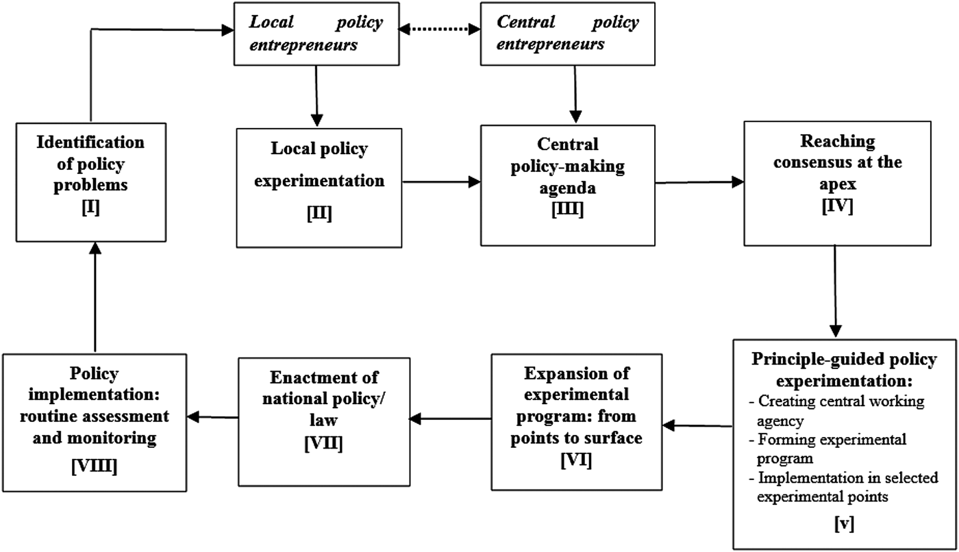 Sebastian Heilmann pioneered a model of China's reform-era experimentation-based policy process, which he refers to as “experimentation under hierarchy.”Footnote 10 In his model, experimental programmes are usually initiated by local officials who need to tackle pressing local issues and are largely motivated to pursue personal interests, though they may usually need support and protection from some individual high-ranking officials. If positive results are produced from local experiments and more top-level decision makers support the policy innovation, a national experimental programme is likely to be formulated and implemented “from points to surface.” With further expansion of the experimental programme, a new national law or regulation will be drafted through inter-ministerial review. Then the new law will be passed by decision makers at the apex and can finally be implemented nationwide.