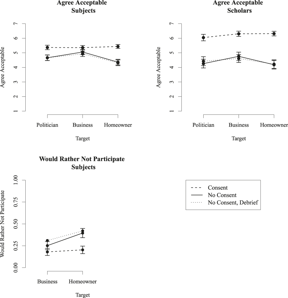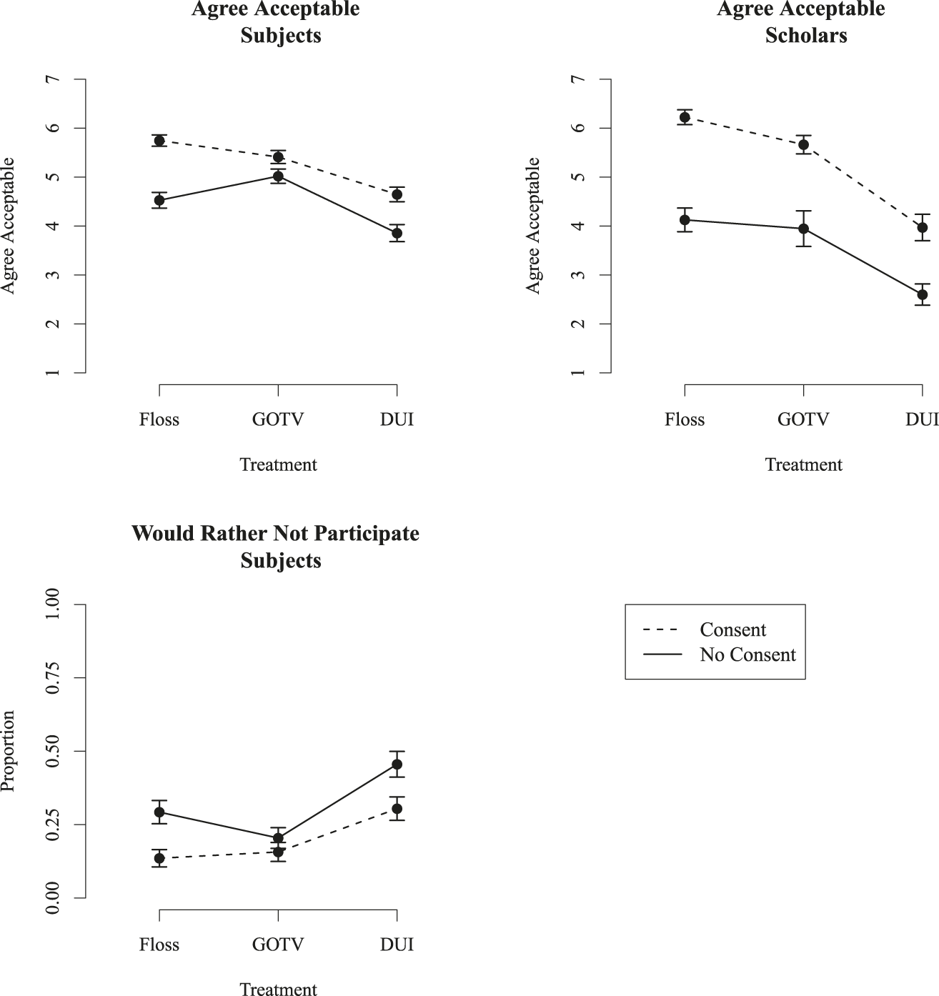I offer four primary empirical findings. First, both subjects and scholars react negatively to experiments without consent and to all forms of deception. For both populations, removing consent or adding deception significantly reduced mean acceptability scores, even for minimal risk and minimally intrusive experiments. For scholars, designs without informed consent were polarizing and reveal divisions among political scientists.