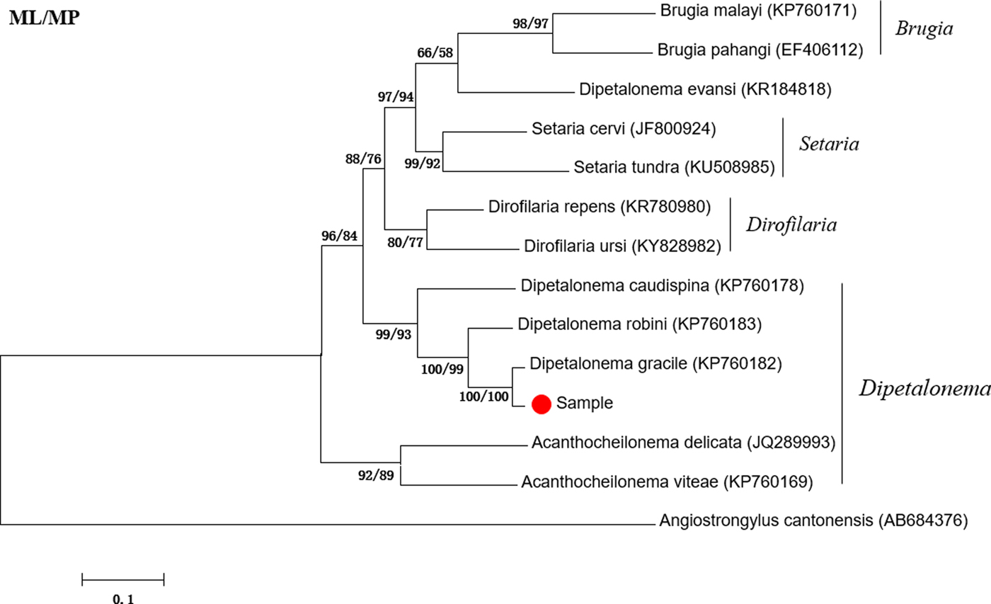 Fig. 1. Phylogenetic tree based on the cox1 gene of Dipetalonema gracile and other Onchocercidae nematodes by maximum likelihood (ML) and maximum parsimony (MP) methods.