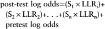 However, such an approach has been termed ‘naïve’ or ‘idiot's Bayes’ (Reference FeinsteinFeinstein, 1977), as it does not account for the double counting of evidence from related risk factors. In practice, it typically overcounts diagnostic or predictive evidence and produces over-predictive models. A multivariate method to adjust for such confounding while preserving expression of the results in terms of LRs has been developed (Reference Spiegelhalter and Knill-JonesSpiegelhalter & Knill-Jones, 1984). Noting that the ‘naïve Bayes’ model can be written in terms of a sum of log likelihood ratios (LLRi):