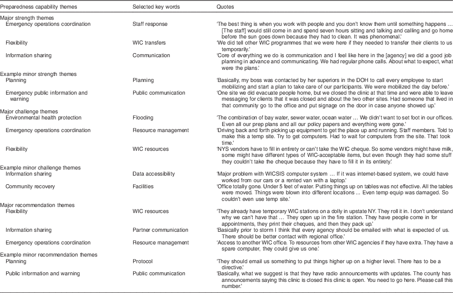 Three major preparedness capability themes related to strengths of the WIC programme’s preparedness and response were identified. These were ‘emergency operations coordination’, ‘flexibility’ and ‘information sharing’ preparedness capabilities. Within the ‘emergency operations coordination’ theme, the willingness and dedication exhibited by staff in providing services to their clients was a commonly cited strength. In the aftermath of Sandy, some staff took on extra coordination responsibilities to support accessibility of WIC services despite the negative impacts (loss of electricity at their homes, damage to or even loss of their homes, etc.) they had experienced themselves due to Sandy.