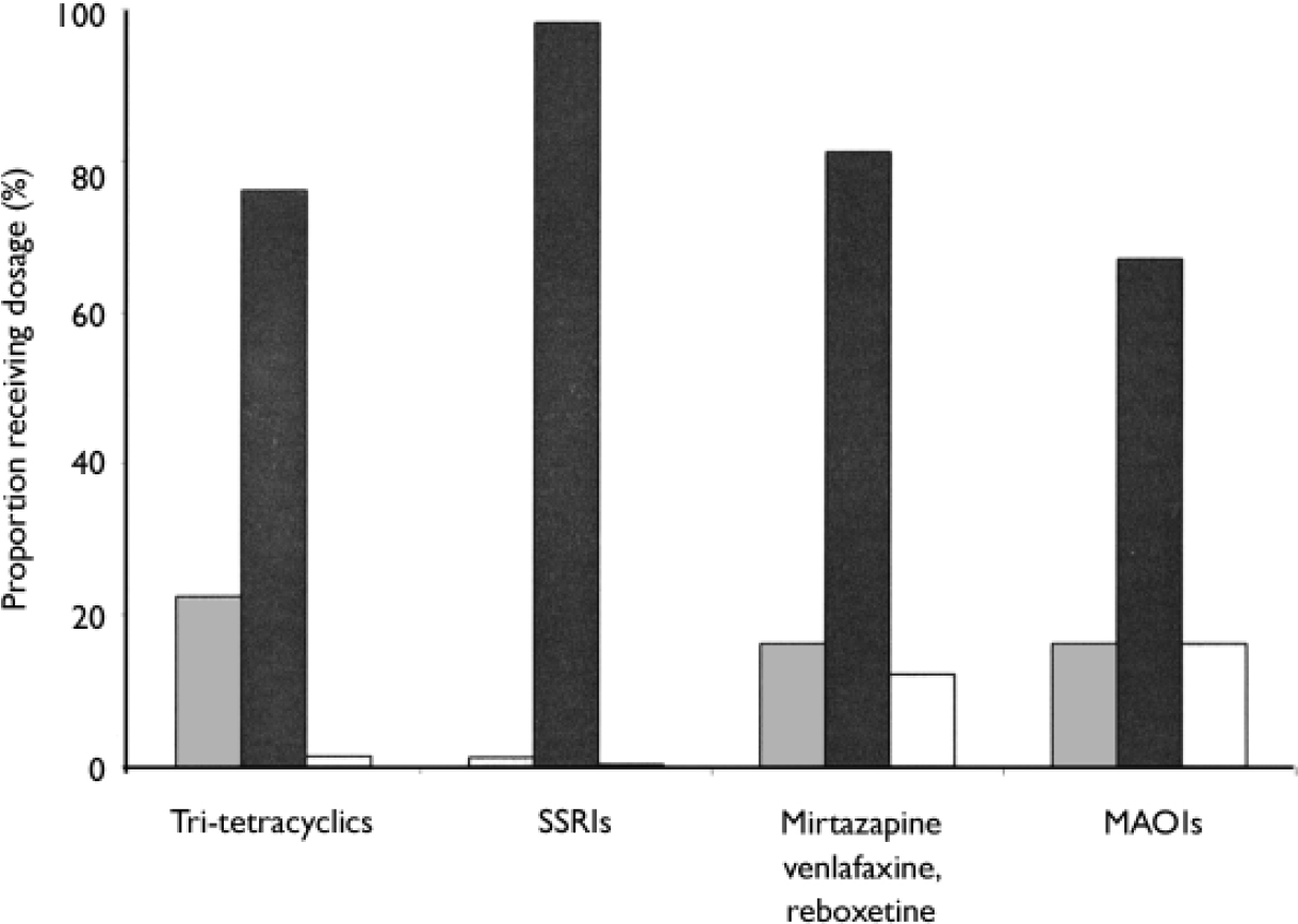 , Below recommendation; ▪, adequate; □, above recommendation; SSRI, selective serotonin reuptake inhibitor; MAOI, monoamine oxidase inhibitor.