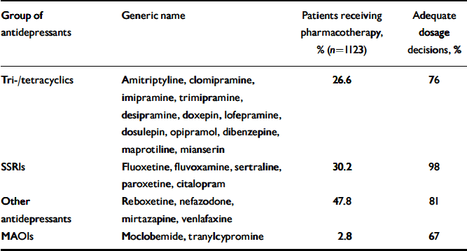 | Group of antidepressants | Generic name | Patients receiving pharmacotherapy, % (n=1123) | Adequate dosage decisions, % |