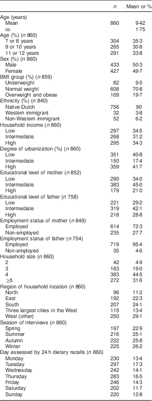 The sample consisted of 860 children, with fewer respondents in the 9–10 years category than in the youngest and oldest age categories (Table 1). Boys and girls were evenly distributed, and 71 % of the sample had a normal weight, while 20 % were overweight and 10 % were underweight. Overweight children and children of Dutch native ethnicity were somewhat over-represented, compared with the general Dutch population( 35 , Reference Schonbeck, Talma and van Dommelen 37 ). Compared with the general Dutch population, mothers and fathers with a high educational level were over-represented, while fathers and mothers with a low educational level were under-represented( 35 ). About 70 % of the mothers and more than 90 % of the fathers were employed. Almost half of the households consisted of four persons. The distribution of households across regions was comparable to that of the general Dutch population( 35 ).