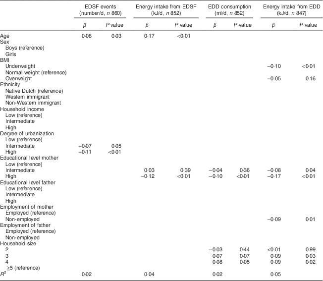 Age and the degree of urbanization were found to be significant correlates of the number of EDSF events after backward linear regression analyses (Table 3). With regard to energy intake from EDSF, the most important sociodemographic factors were age and the mother’s educational level. Educational level of the mother was also a significant correlate of EDD consumption together with household size, both in terms of amount and energy. Energy intake from EDD was additionally explained by the child’s BMI and mother’s employment.