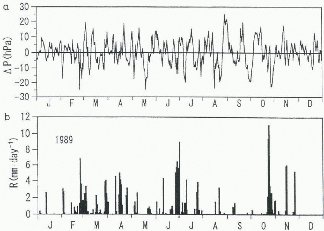 figure 3a represents variations in mean sea-level pressure shown as deviations from 30 day mean values. The ligure indicates that the snowfall usually occurred when the deviation of pressure was negative. This suggests that the snowfalls were associated with low-pressure systems. Carle-ton (1992) also noted that synoptic-scale cyclones are important in the supply of moisture in the form of clouds and precipitation in Antarctica. However, snowfalls did not always occur whenever the deviation of pressure was negative. Some lows did not bring snowfall to Syowa station.