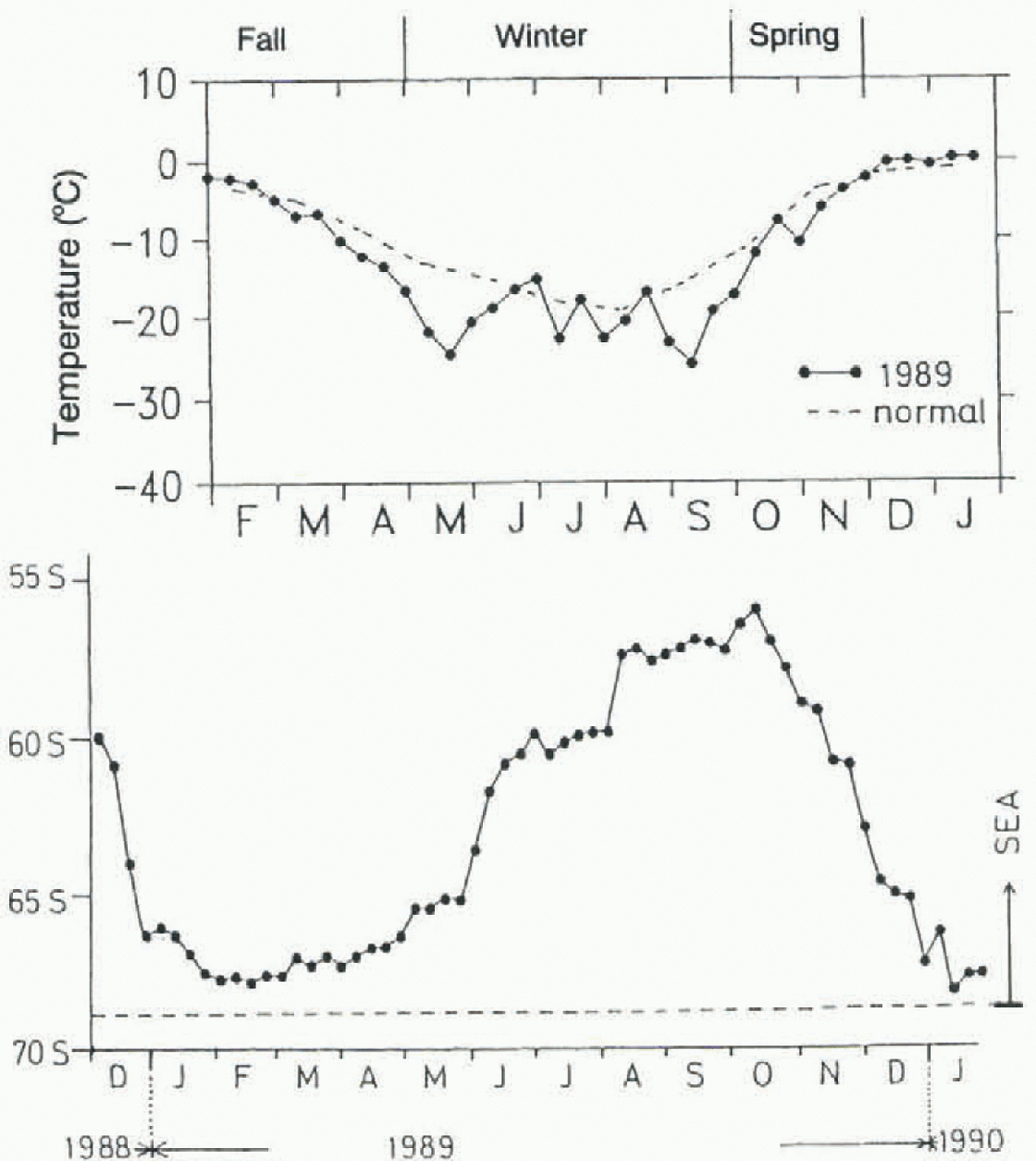 Fig. 4. (a) 10 day averages of temperature observed at Syowa station. Solid line and dashed line show values in 1989 and in a normal year, respectively, (b) Sea-ice edge along longitude 40° Ε defined as the boundary of ice concentration larger than 80%.