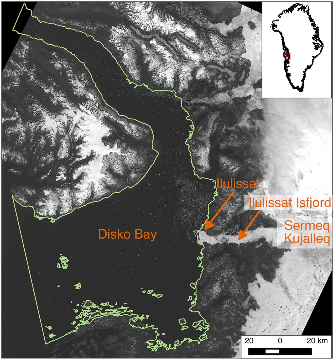 Fig. 1. Location of Disko Bay, the study region, in West Greenland. Features of note include Sermeq Kujalleq (i.e. the iceberg source), Ilulissat Isfjord, the town of Ilulissat, and the study region of interest (ROI, green outline). Background is a mosaic of Landsat 8 panchromatic images from summer 2015.